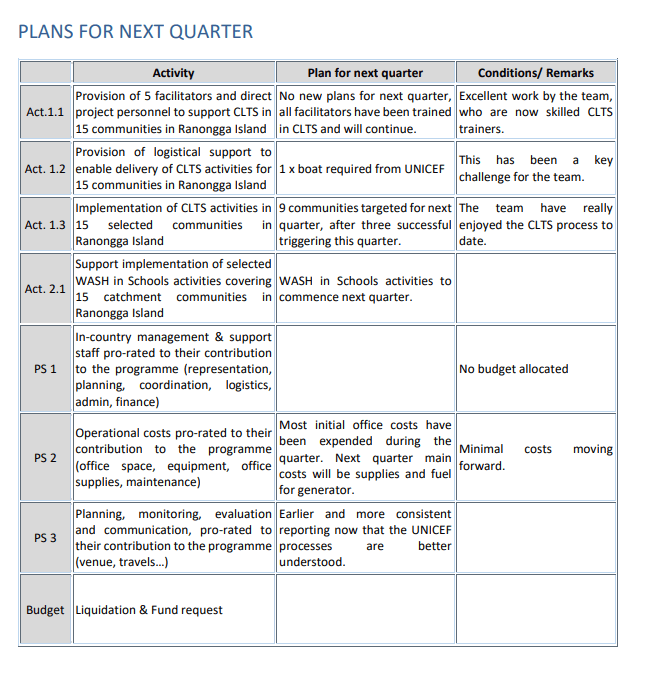 The first quarter has been successful, but has been a lesson in CLTS specifically, and UNICEF processes more generally for the SRCA team. The key lesson learnt has been the reporting and documentation requirements of UNICEF. The SRCA team has developed a system for planning, tracking and reporting costs on a regular basis, to be able to provide UNICEF with a high level of visibility of expenditure against the budget. This allows for the quick identification of budget under and overruns. Now that the team have completed three village visits, they have the following observations to